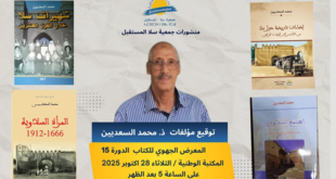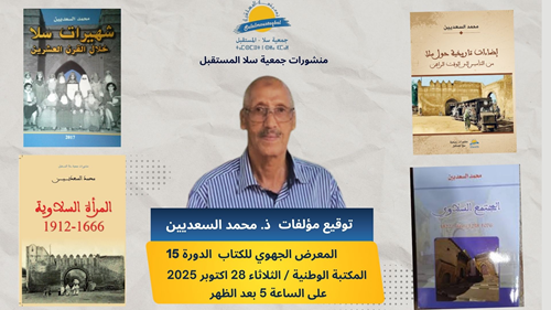 ض تم بالأمس الثلاثاء 28 أكتوبر 2025 توقيع كتابين للأستاذ محمد السعديين برواق جمعية سلا المستقبل ومؤسسة سلا للثقافة والفنون بالمعرض الجهوي بالرباط-الكتابان من منشورات جمعية سلا المستقبل – يحمل الكتاب الأول عنوان ” المجتمع السلاوي 1666-1822″ ويتناول عدة جوانب من التطور الذي عرفه المجتمع السلاوي من نشأة الدولة العلوية …