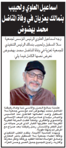 وبهذه المناسبة الأليمة، يتقدم المكتب التنفيذي و كافة أعضاء جمعية سلا المستقبل بأحر التعازي وصادق المواساة لعائلة الفقيد ورفاقه و لكل معارفه وأقاربه