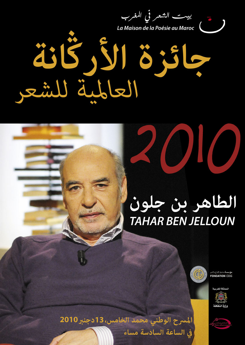 يتسلّم الكاتب والشاعر المغربي الطاهر بن جلون ” جائزة الأركانة العالمية للشعر” التي يمنحها بيت الشعر في المغرب ومؤسسة صندوق الإيداع والتدبير، بدعم من وزارة الثقافة ومسرح محمد الخامس، وذلك يوم 13 دجنبر 2010 على الساعة السادسة مساء بالمسرح الوطني محمد الخامس بالرباط .