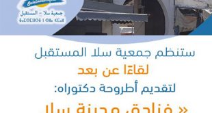 تنظم جمعية سلا المستقبل لقاءً عن بعد لتقديم أطروحة دكتوراه في موضوع: فنادق مدينة سلا، دراسة تاريخية ومعمارية للدكتور خالد عبوبي و يتضمن هذا البحث دراسة تاريخية ومعمارية لفنادق مدينة سلا، خلال الفترة الممتدة من القرن السادس الهجري/ 12م إلى حدود سنة 1352هـ/1934م، مما يجعله يغطي حقبا متباينة من تاريخ …